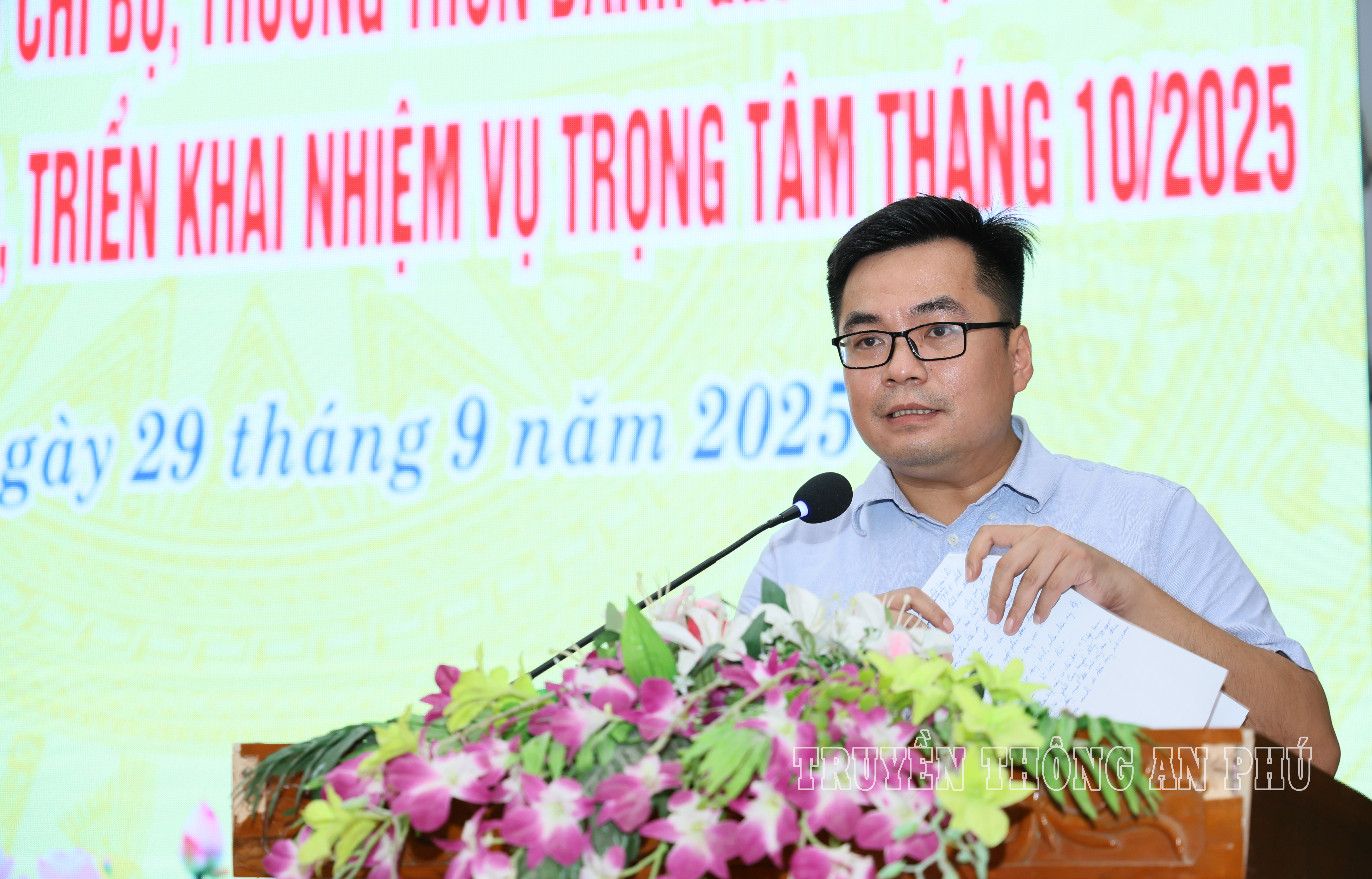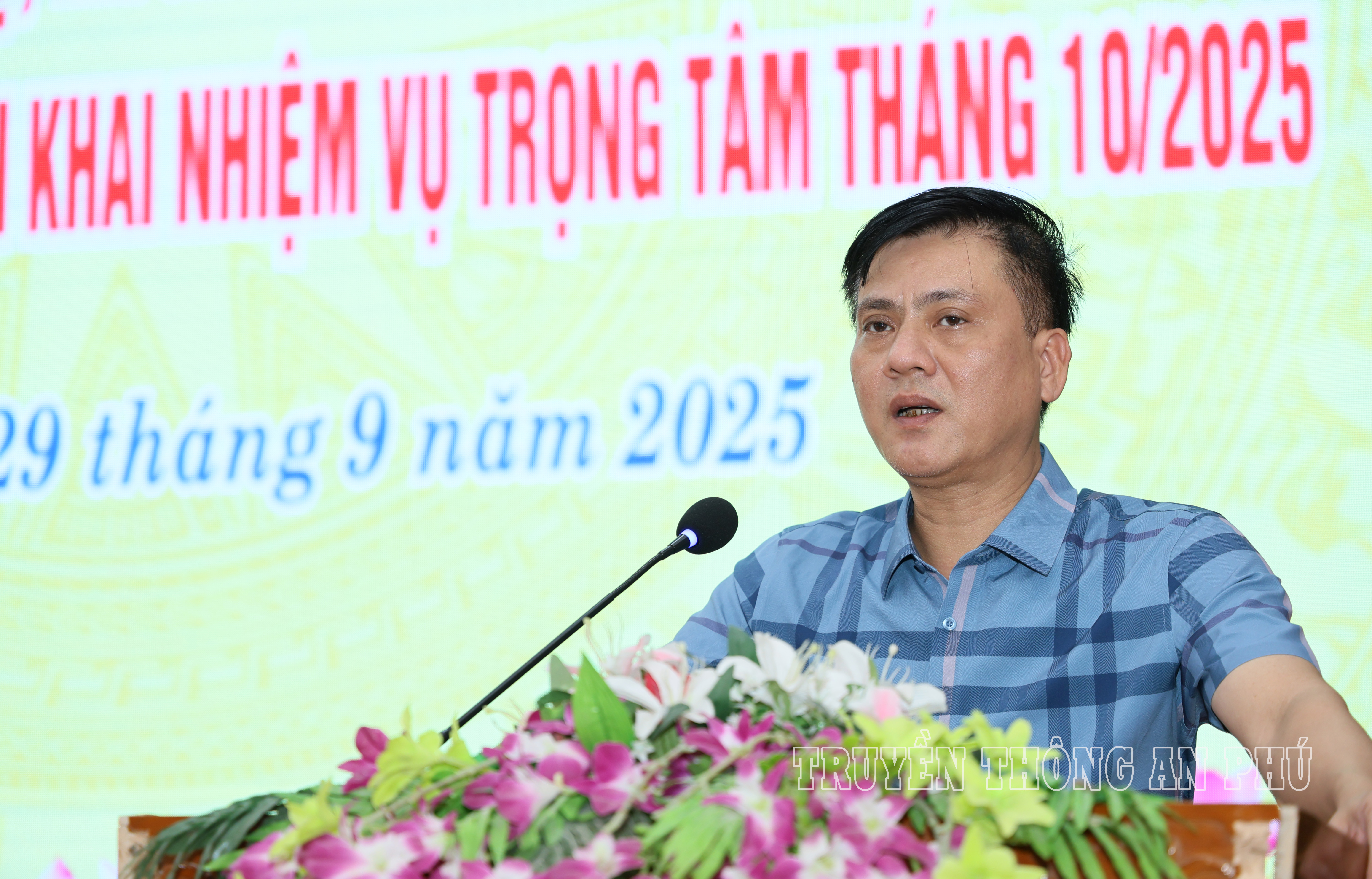 Chiều 29/9, Đảng ủy xã An Phú tổ chức Hội nghị giao ban với Bí thư chi bộ, Trưởng thôn nhằm đánh giá kết quả thực hiện nhiệm vụ tháng 9, triển khai nhiệm vụ trọng tâm tháng 10/2025. Các đồng chí: Nguyễn Duy Hưng – Bí thư Đảng ủy, Chủ tịch HĐND xã; Trần Thị Thanh Huyền – Phó Bí thư Thường trực Đảng ủy; Nguyễn Đình Dũng – Phó Bí thư Đảng ủy, Chủ tịch UBND xã đồng chủ trì hội nghị. Tham dự có các đồng chí trong Ban Thường vụ Đảng ủy; lãnh đạo các phòng, ban, cơ quan; Bí thư chi bộ, trưởng thôn; Hiệu trưởng các trường học trên địa bàn xã.