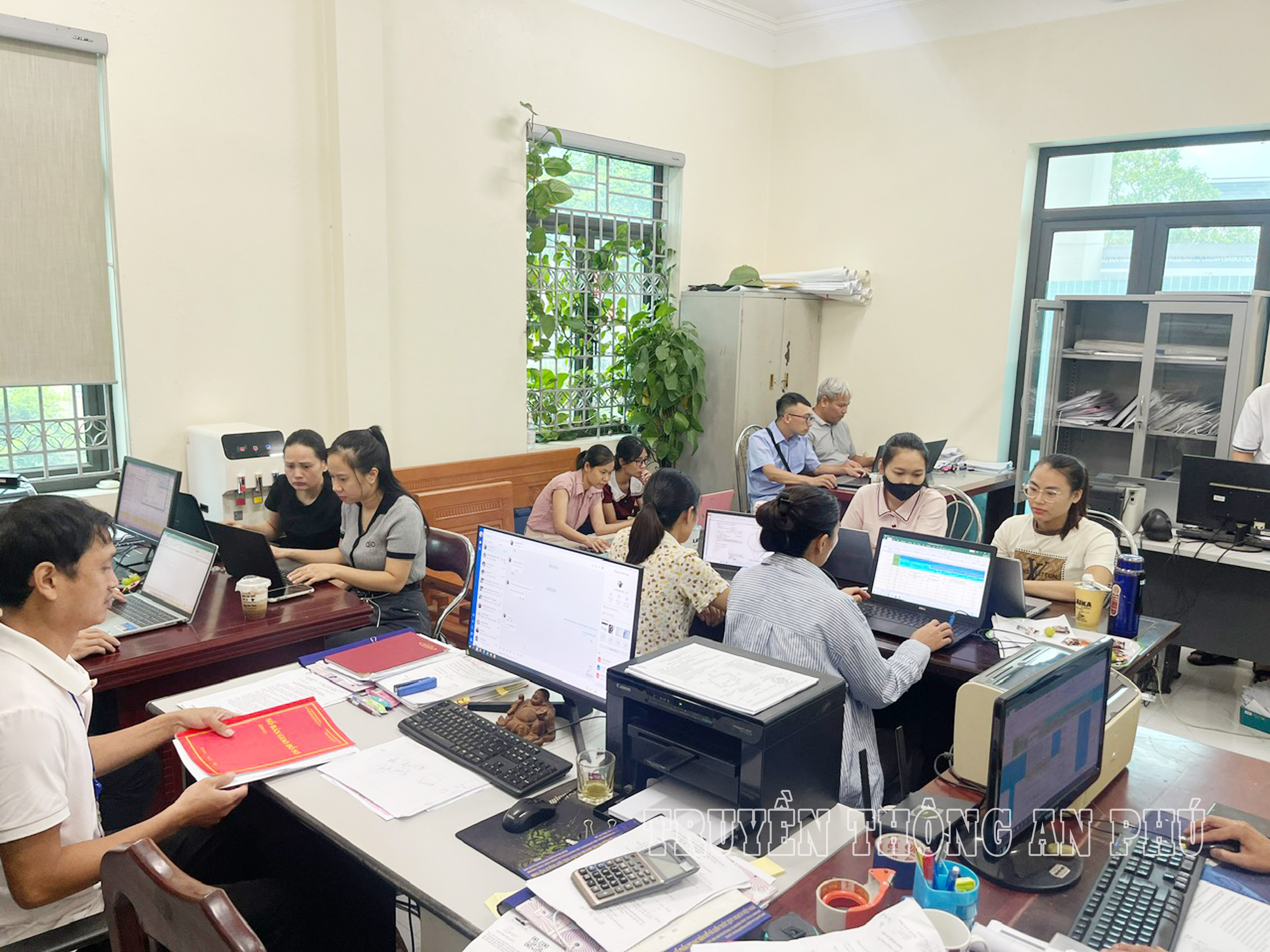 Cán bộ phòng Kinh tế xã An Phú và các đồng chí được tăng cường đang tập trung hoàn thành việc làm sạch dữ liệu về đất đai