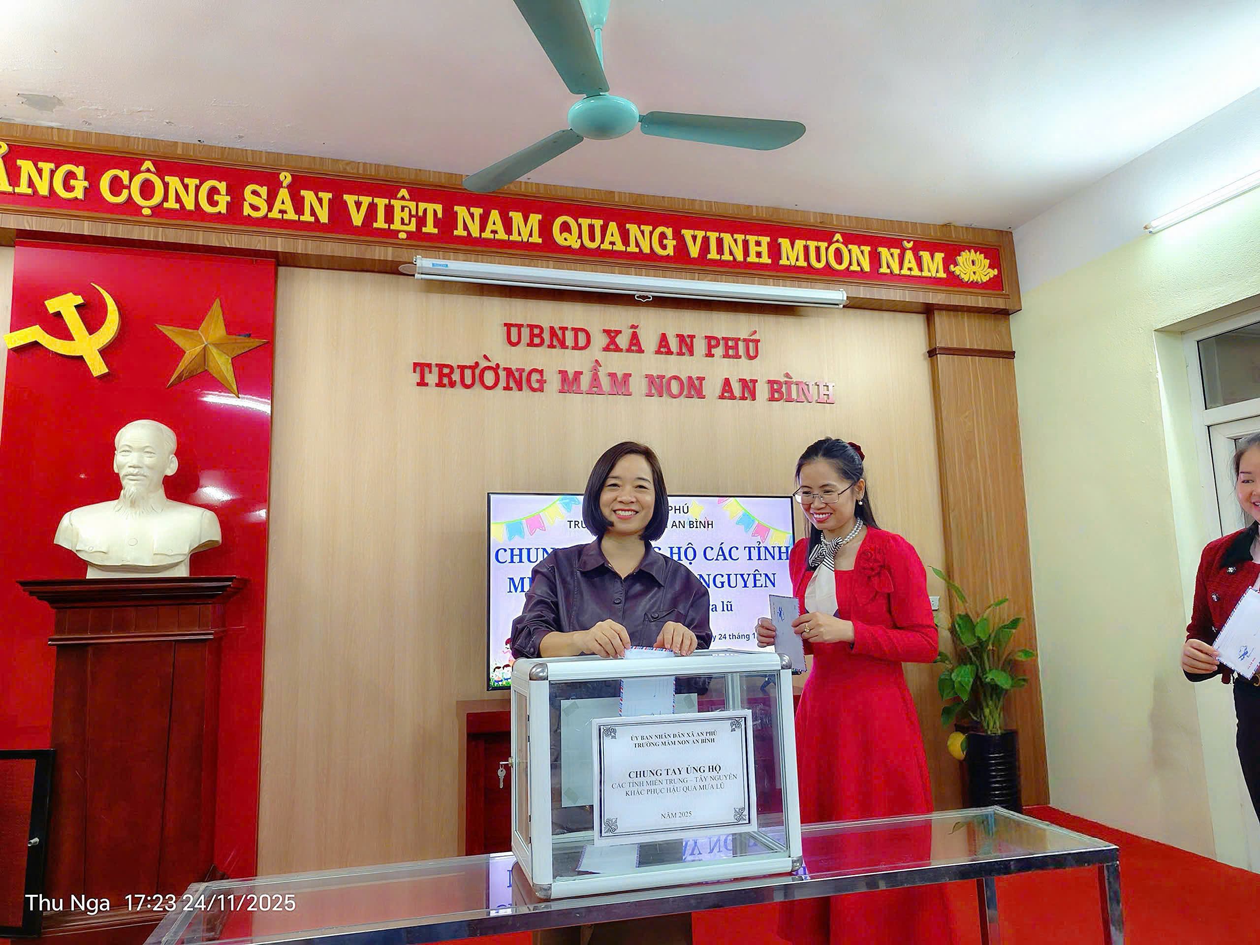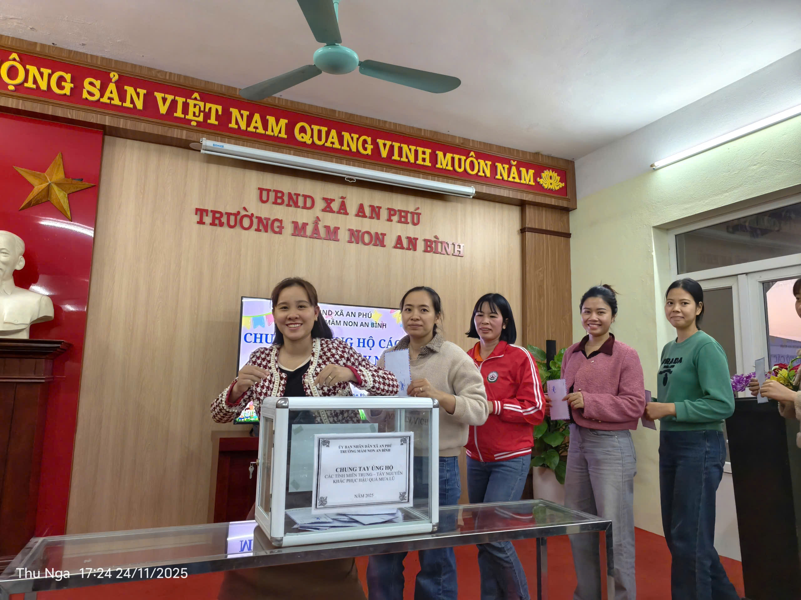Hưởng ứng Thư kêu gọi của Ủy ban Mặt trận Tổ quốc Việt Nam xã An Phú, Trường Mầm non An Bình đã phát động toàn thể cán bộ, giáo viên, nhân viên nhà trường phát huy tinh thần “nhường cơm sẻ áo”, “tương thân tương ái”, chung tay hỗ trợ đồng bào vùng lũ vượt qua khó khăn, ổn định cuộc sống.