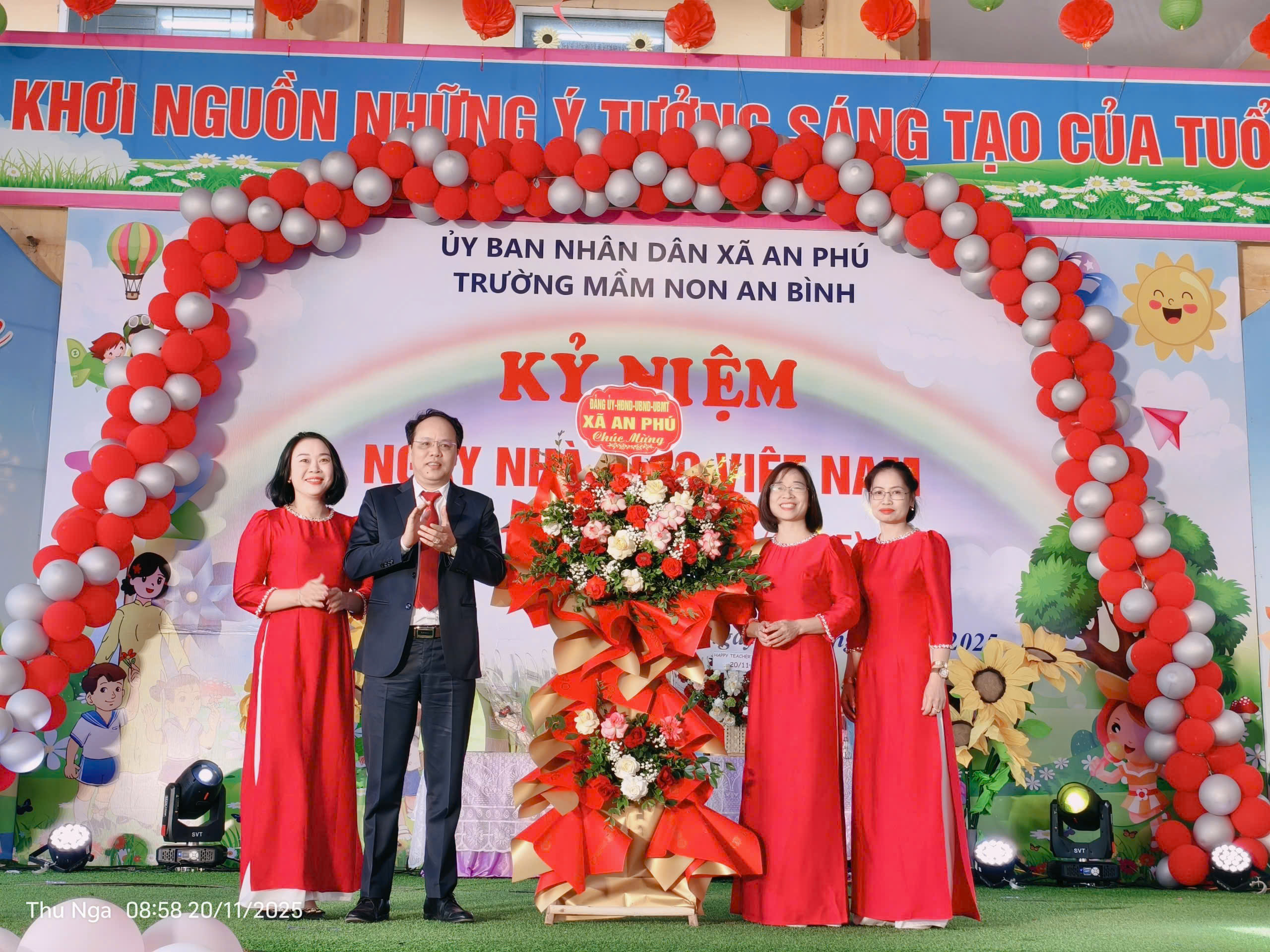 Trong không khí rộn ràng, tươi vui của tháng 11 tháng tri ân những người làm công tác giáo dục, tập thể cán bộ quản lý, giáo viên, nhân viên và các em nhỏ Trường Mầm non An Bình đã có nhiều hoạt động sôi nổi, thiết thực kỷ niệm 43 năm Ngày Nhà giáo Việt Nam (20/11/1982 – 20/11/2025). Đây là dịp để nhà trường thể hiện lòng biết ơn sâu sắc tới các cô giáo, những người đã và đang tận tâm, tận tụy chăm sóc và nuôi dưỡng các mầm non tương lai của đất nước. Đồng chí Nguyễn Trọng Phan - Ủy viên Ban Thường vụ Đảng ủy, Phó Chủ tịch HĐND xã tới dự, chúc mừng nhà trường.
